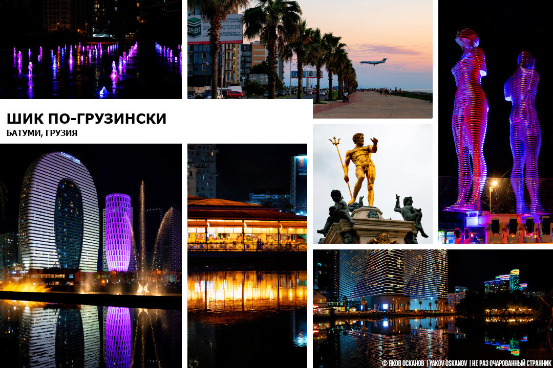 Я много слышал и читал о том, что Батуми в последнее время сильно расстраивается, осовременился и стал походить на крутые мировые курорты. Однако относился к этому с изрядной долей скепсиса: построить пару дорогих отелей – ещё не значит стать курортом с мировым именем. Первые впечатления были, впрочем, приятными. Мы приехали в город к вечеру, так как выехали из Тбилиси с утра. Поселились в отеле на проспекте Леха и Марии Качински. В первой линии у моря. Набережная была шикарной и напомнила мне кадры из голливудских фильмов, где показывают такие набережные с пальмами где-нибудь в Калифорнии или Флориде. Ещё набережная напомнила мне Тель-Авив. Там тоже длинная набережная с хорошо развитой инфраструктурой. Отель наш был на окраине города, и мы пошли от него к центру. Широкая пешеходная дорога идёт вдоль всего берега к старой части города. На ней есть велосипедные велодорожки, справа разбиты скверы с фонтанами, лавочками и различными инсталляциями для того, чтобы туристам было на фоне че