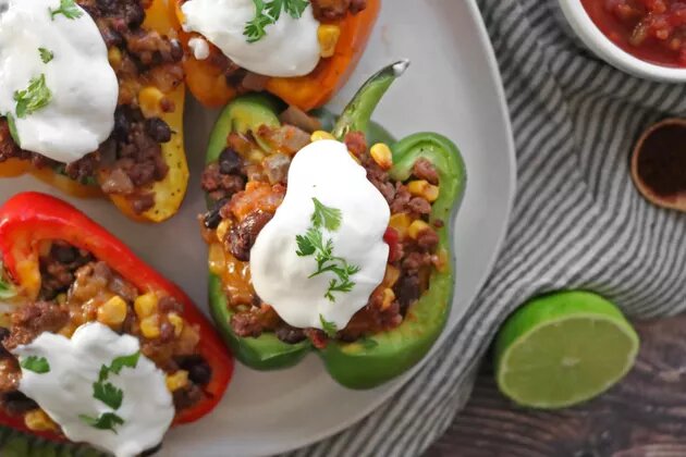 Сделайте каждый день "вторник тако" с этими вкусными фаршированными перцами. Наслаждайтесь ими в качестве закуски, гарнира или основного блюда! Вы даже можете сделать их безмолочными, отказавшись от сыра или используя немолочный сыр и сметану. Если вы сокращаете потребление рафинированных углеводов или просто хотите есть больше овощей, вам понравится этот пикантный рецепт. Что вам понадобится: 4 болгарских перца Оливковое масло Соль и перец по вкусу 1/2 среднего желтого лука, измельченного 1 столовая ложка рубленого чеснока 1 фунт говяжьего фарша 3 столовые ложки приправы тако 3/4 чашки черной фасоли 3/4 чашки кукурузы 1/2 чашки сальсы 1 1/3 чашки измельченного сыра чеддер Лайм Свежая кинза Сметана Совет В зависимости от размера вашего болгарского перца, вам может понадобиться 5 или 6 штук. Шаг 1 Разогрейте духовку до 190°c. Тем временем разрежьте перцы пополам и удалите семена. Шаг 2 Перенесите нарезанный болгарский перец в большую форму для выпечки. Сбрызните оливковым маслом и прип