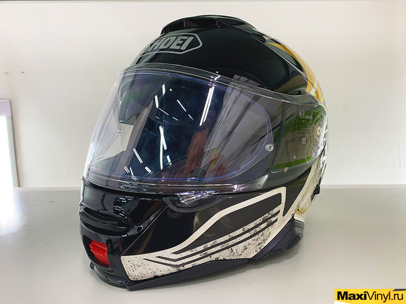 К нам обратился клиент, которому мы ранее оклеивали мотоцикл в такой же стилистике, он захотел чтобы его шлем сочетался с его железным конем. На основе макета для его мотоцикла нами был разработан макет на шлем. Учитывая, что шлем имеет шарообразную форму, оклеить его довольно сложно, но мы оклеили его таким образом, что нигде не потребовались стыки, соответственно оклейка получилась в виде двух больших наклеек слева и справа и двух наклеек наверху и сзади. Выполнено: