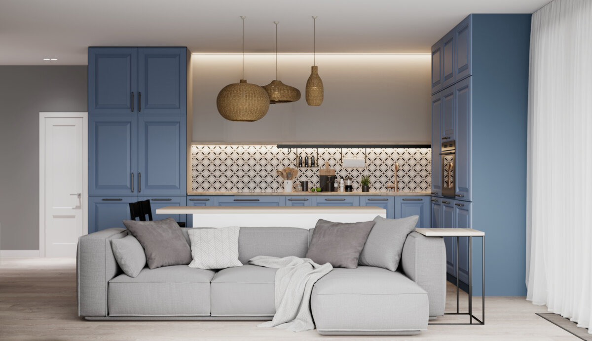 Наши заказчики предпочли фасады в классическом исполнении с филенками. Использование синего цвета фасадов визуально освежает помещение, делая его легким.