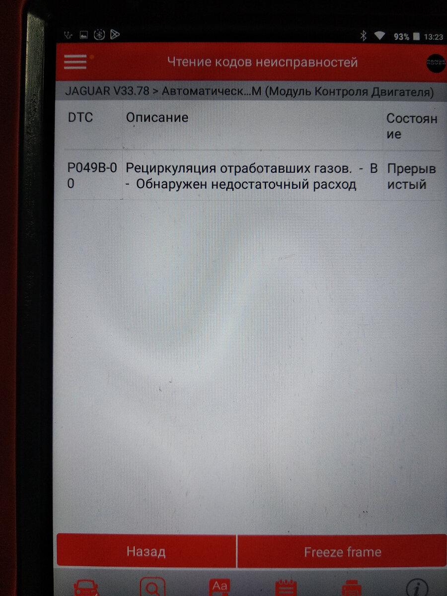 Приветствую! Хочу рассмотреть особенность конструкции системы EGR низкого давления на а/м Jaguar XE X760 16 модельного года из-за которой появляется код неисправности P049B-00 и загорается индикатор неисправности системы управления двигателем (Чек-энжин). (недорогие и качественные запасные части JLR https://mvo.bz/6nm14m) Причина обращения: Горит лампа неисправности двигателя, ограничения в работе двигателя нет. 1. Считываю коды: 2. Смотрю рекомендации производителя к коду. Первым пунктом указано, что необходимо заменить фильтр охладителя системы EGR низкого давления. 3. Немного теории: В системе понижения токсичности для стандартов евро 5 и 6 предусмотрено 2 контура рециркуляции отработавших газов (EGR). Контур высокого давления - в выпускном коллекторе перед горячей стороной турбокомпрессора наддува и низкого давления - в выпускном тракте после сажевого фильтра. Надо признать, что 2 ух контурная система EGR, в комплекте с огромным каталитическим нейтрализатором отработавших га