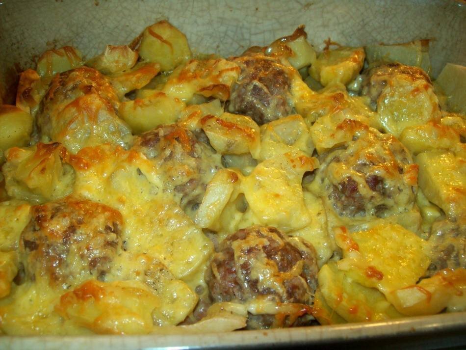 Ингредиенты: • картофель – 1 кг. • мясной фарш – 400 г. • лук – 1 шт. • яйцо – 1 шт. • рис – 1/2 ст. • перец, соль – по вкусу Приготовление: 1. В мясной фарш добавляем лук, чеснок, яйцо, соль, перец, отварной рис и все перемешиваем. 2. Формируем в виде шариков, выкладываем на противень, свободные места заполняем картошкой. 3. Солим картофель по вкусу, сверху посыпаем тёртым сыром и ставим в духовку при 190 градусах на 30-40 минут #от2лет #обед #ужин