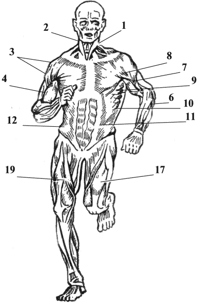 Мышцы представляют собой активную часть опорно-двигательного аппарата человека. Благодаря их сокращению человек способен выполнять различные движения и решать двигательные задачи. Мышцы человека составляют около 30–40% веса тела. В теле человека насчитывается около 600 отдельных мышц. Каждая отдельная мышца имеет свое название: по функции (сгибатели, разгибатели); по форме (камбаловидная, трапециевидная); по числу головок (двуглавая, трехглавая); по положению на теле (межреберные).