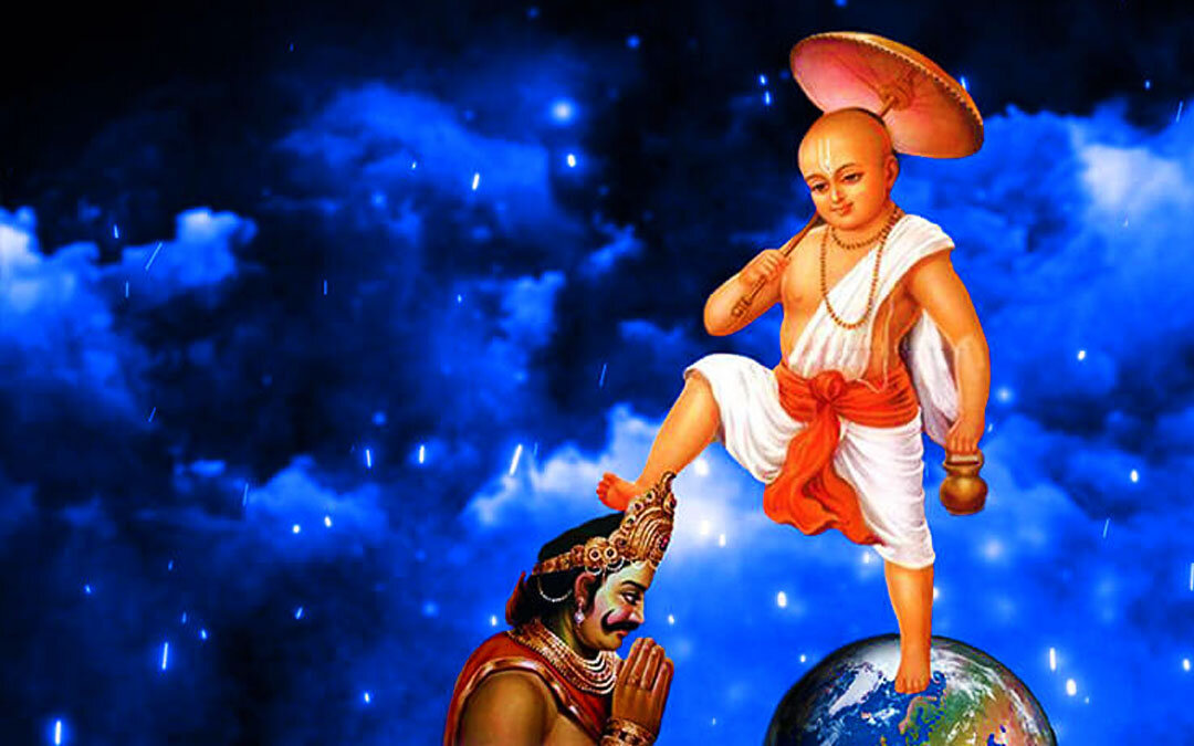 Однажды всеми мирами правил царь - Бали Чакраварти. Отцом Бали был сын Прахлады - Вирочана, а матерью — Девамба. Вишну принял облик мальчика-карлика Ваманы и, явившись перед Бали, попросил у него кусок земли размером в три шага. Бали согласился выполнить желание Ваманы. Тут Вамана начал расти, непомерно увеличившись в своих размерах и за два шага покрыл всю Землю, небо, небесные планеты и остальную часть вселенной. Третьим шагом он наступил на голову Бали.