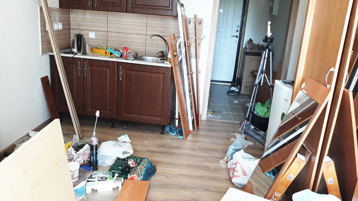 Приветствую вас на моем канале. Месяц ничего тут не писал, был в отпуске. Как вы помните, ровно за 4 недели до этого отпуска я начал ремонт в своей новой квартире-студии, которую мы с женой купили под сдачу в аренду. Задача стояла не простая. Нужно было успеть сделать весь ремонт ровно за 4 недели и сдать ее перед тем, как отправиться в отпуск. Если вы не видели, как проходил этот ремонтный марафон, то можете перечитать все самого начала. Вот ссылки на предыдущие статьи. А сегодня я покажу к чему мы пришли под конец 4-ой недели своего ремонта. Вот так выглядела квартира за день до ее сдачи. Полный бардак. Спустя сутки она уже выглядела вот так. Тут две фотографии. Одна при солнечном свете, вторая при свете ламп. На стене, которая расположена напротив дивана, разместилась полочка под небольшой телевизор. Чуть левее этой полочки стоит вместительный шкаф для вещей. Он, конечно далеко не новый, но несколько лет еще должен послужить. Кухня у нас получилась вот такая. Мебель из Мерлена. На в