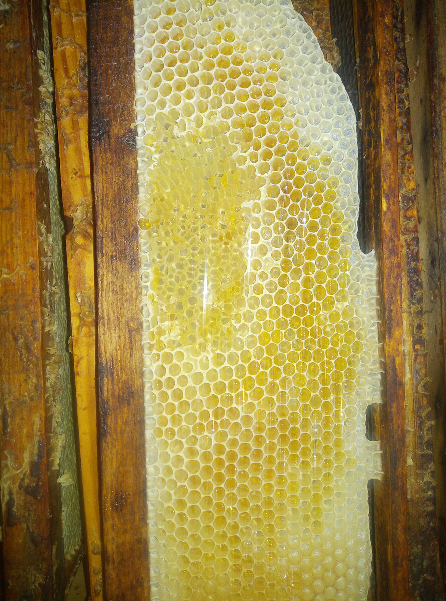 На фото рамка после медогонки, где более сухой и запечатанный мед в центре откачан, а более влажный, поздний и незапечатанный вересковый все еще в сотах.