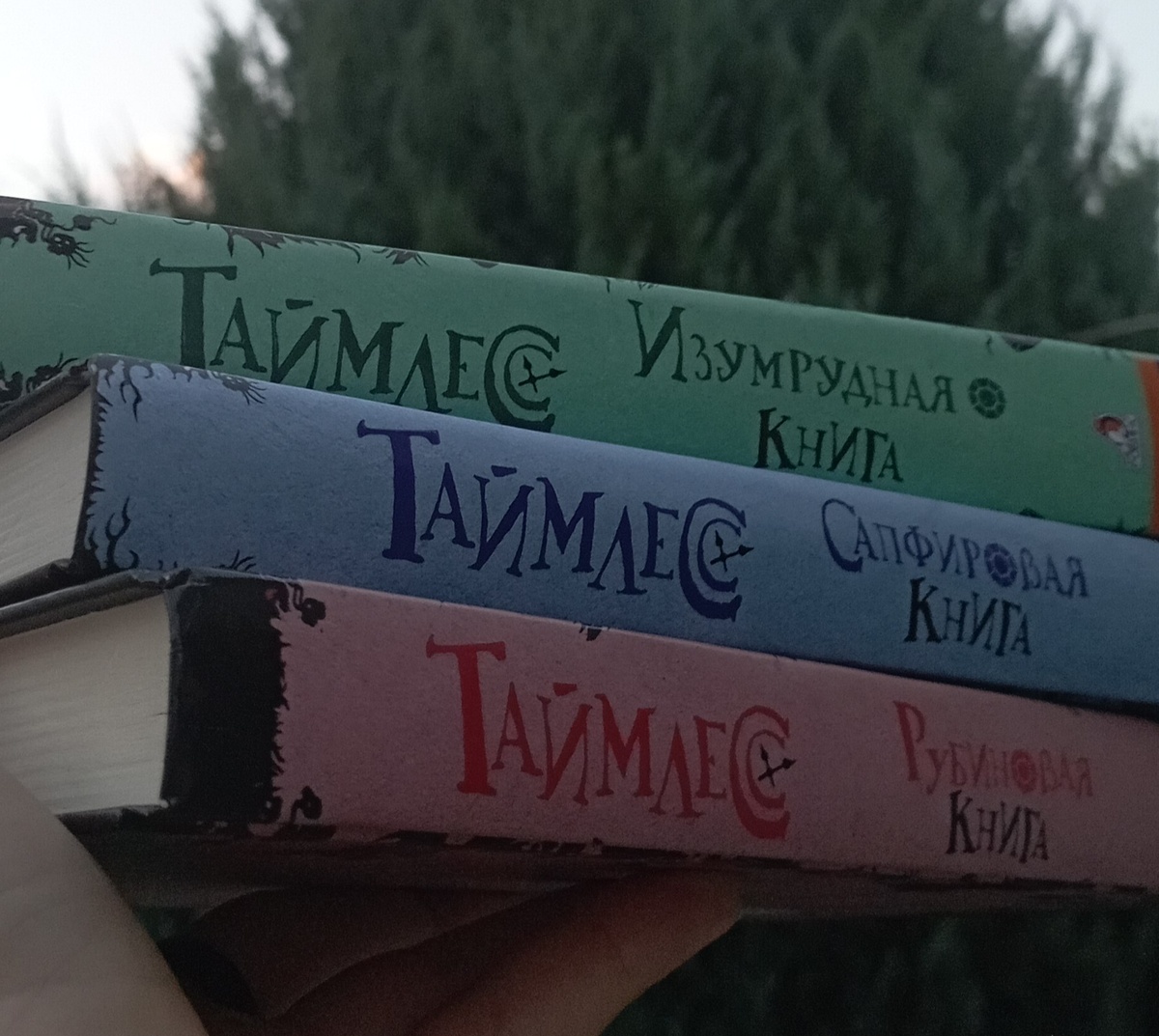 Трилогия "Таймлесс" Керстин Гир Моя оценка за все книги: 7/10 Их я читала примерно год назад и, насколько я знаю, то у многих любовь к чтению появилась благодаря этой трилогии. К числу этих людей я не отношусь, но всё же в каком-то смысле книги очень даже повлияли на моë отношение к чтению. Отмечу, что в хорошем смысле! И поэтому, планирую заказать что-то ещё от этого автора. Итак, сама трилогия очень необычна, здесь присутствует атмосфера 18-19 веков, так как большинство событий происходит в прошлом. Хочу сказать, что мне стало интересно и я даже посмотрела три фильма по этим книгам. Иииии, что и стоило ожидать, фильмы чем-то отличались от книг. Но мне понравилось. Что касается трилогии, мне очень понравились все эти перескоки в разные эпохи времени. Правда мне не хватило описания атмосферы прошлых лет. Любовная линия здесь банальная, троп от ненависти до любви. Но блин, давайте признаем, что это клише нравится многим. Гвендолин Шеферд - с виду обычная девушка, которая томится в тени
