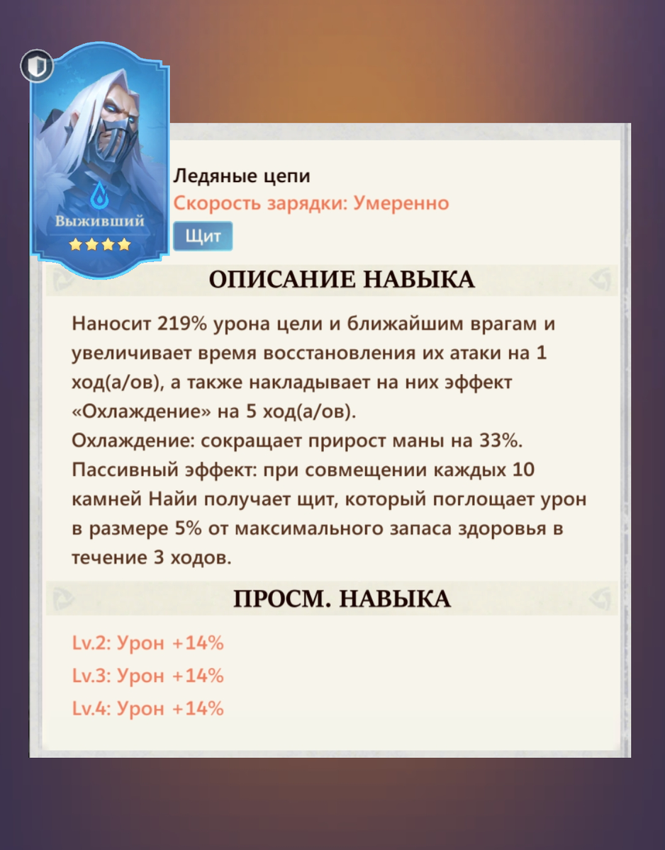 Выживший Рейтинг полезности:🔸🔸🔸🔸. 🔹🔹🔹🔹 в составе цвета. 🔻🔻🔻🔻🔻 в составе фракции. 🔹 Герои Сила. 🔹Заряд навыка 9 камней. 🔹 Костюм НЕТ. 🔹 Призыв: Любой призыв . 🔹 особенности: Выжевший, само имя даёт понять что это за персонаж. Это одна из четвёрок игры которая не теряет актуальности со временем.По мере развития и пробуждения Выжевший будет наращивать свои щиты, апогеем станет получение именного оружия. На ранних стадиях игры его можно смело использовать как в атаке так и в защите, в атаке добавьте к нему аху, выжевший нанося удар замораживает три цели урезая прирост манны и давая аху возможность наносить дополнительный урон. Добавьте к этому возможность ношения выжевшим кнута энергичности его живучесть позволит прожить достаточно долго чтобы ударить скилом даже под перегрузкой от оружия. На более поздних этапах игры герой перестанет быть нужным в атаке, но все также будет востребован в защите на арене и воине гильдий. Выжевший отлично заидет на поле топор, количество