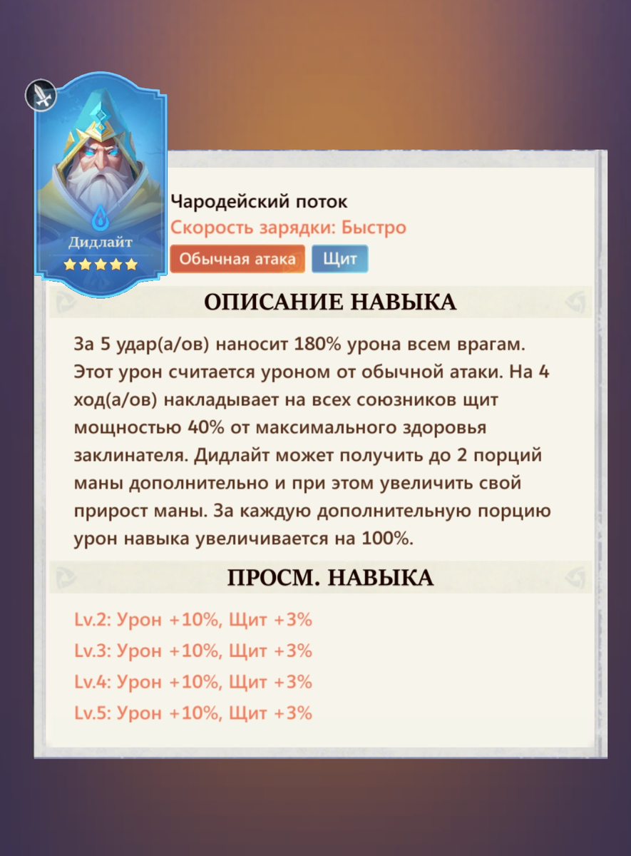 Дидлайт Рейтинг полезности:🔸🔸🔸🔸. 🔹🔹🔹🔹 в составе цвета. 🔻🔻🔻🔻🔻 в составе фракции. 🔹 Герои Интеллект. 🔹Заряд навыка 7 камней. 🔹 Костюм НЕТ. 🔹 Призыв: именной трехдневный . 🔹 особенности: Герой фракции башня усиливающий и без того высокую живучесть фракции. Хххх отлично заидет в синий моно отряд герой интеллекта способен взять на себя ношение Ока Най освободив тем самым Фиону и Алию для оружия на Ману что для них критично. Слабая атака по всем компенсируется быстрой скоростью заряда и пассивным навыком дающим щиты команде, ещё одним плюсом является то что после полной зарядки излишки манны не уходят в пустую а усиливают атаку навыка, стоит заметить при повторном использовании щит можно обновить но не увеличить. Важно принять во внимание тот факт что атака Дидлаита является обычной что резко уменьшает шанс ответной реакции Коллеты, Джеин и Гарабет но важно учитывать это при выборе оружия. В целом прекрасный герой подходящий в любой отряд для повышения общей живучести ка