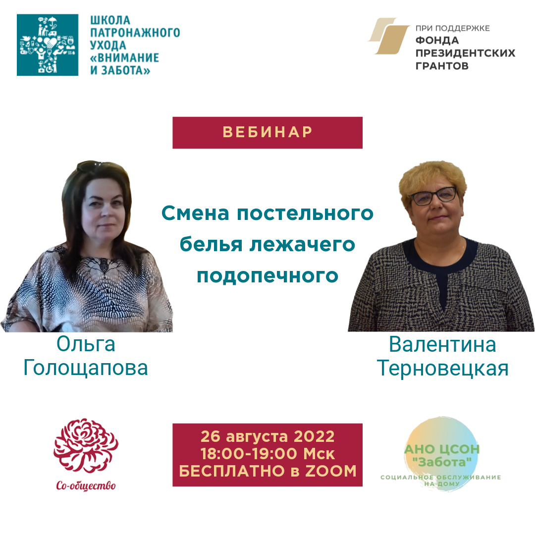 С января этого года Школа патронажного ухода «Внимание и забота» обучает 28 сотрудников НКО из разных регионов страны профессии «Тренер-преподаватель по долговременному уходу». Наши студенты прошли теоретический и практический курс, получили дипломы и под нашим наставничеством начинают проводить свои первые вебинары. Приглашаем вас на вебинар в Zoom «Смена постельного белья лежачего подопечного». Дата и время: 26 августа 2022 г. 18:00-19.00 по московскому времени Спикеры – тренеры-преподаватели: Терновецкая Валентина – АНО Межрайонный ЦСОН «Забота», республика Коми, г. Сосногорск. Ольга Голощапова – АНО «Со-общество», г. Липецк. Поднять, перевернуть, переместить лежачего больного – научиться делать это правильно очень важно и для больного, и для лица, обеспечивающего уход. Основная нагрузка при проведении всех этих манипуляций ложится на позвоночник ухаживающего. Спина страдает в 90% случаев, так как мало кто имел достаточную постоянную физическую нагрузку до этой кризисной ситуации. Н