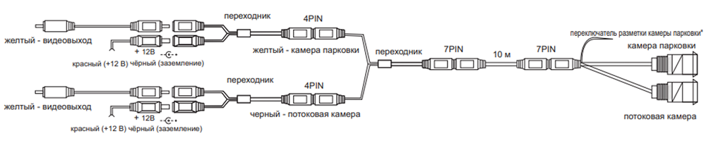 Изображение с таких парковочных камер, включающих в себя потоковые камеры заднего обзора, можно выводить на любой монитор, поддерживающий 2 видео входа, – это могут быть как специализированные мониторы для грузового транспорта с 4-пиновыми резьбовыми разъёмами, так и обычные автомобильные мониторы с RCA (тюльпаны) разъёмами. Для этого в комплектации есть всё необходимое, включая переходники 4 pin на RCA. Изображение с камеры заднего вида будет выводиться автоматически при включении задней передачи, а потоковая камера будет транслировать изображение на монитор постоянно.
