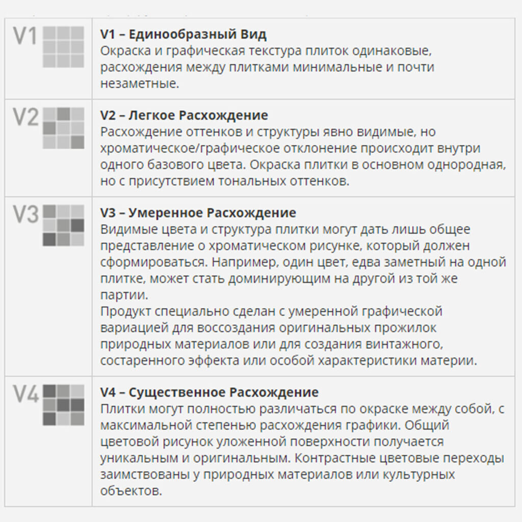С развитием технологий декорирования плитки мы получили возможность создавать керамогранит с максимально реалистичными текстурами, которые очень детально передают все нюансы, присущие мрамору, дереву, камню, бетону и другим природным материалам. В нашей статье мы расскажем коэффициенте неоднородности рисунка или стонализации, который называется VSHADE. Коэффициент VSHADE показывает, насколько плитка однородна по графике и в этом заключается ключевое отличие от тона. Тон показывает степень насыщенности цветом. А VSHADE показывает, насколько рисунок неоднородный, насколько каждая плитка харизматична и обладает своей графикой и своим шармом, то есть насколько каждая плитка будет похожа или не похожа на другую. Существует 4 вида стонализации: Каждое значение стонализации для каждого продукта указывается в генеральном каталоге и на официальном сайте Italon. Открыв страничку с требуемой коллекцией, вы увидите значок – латинскую букву «V», и цифру от 1 до 4, которые обозначают, насколько этот