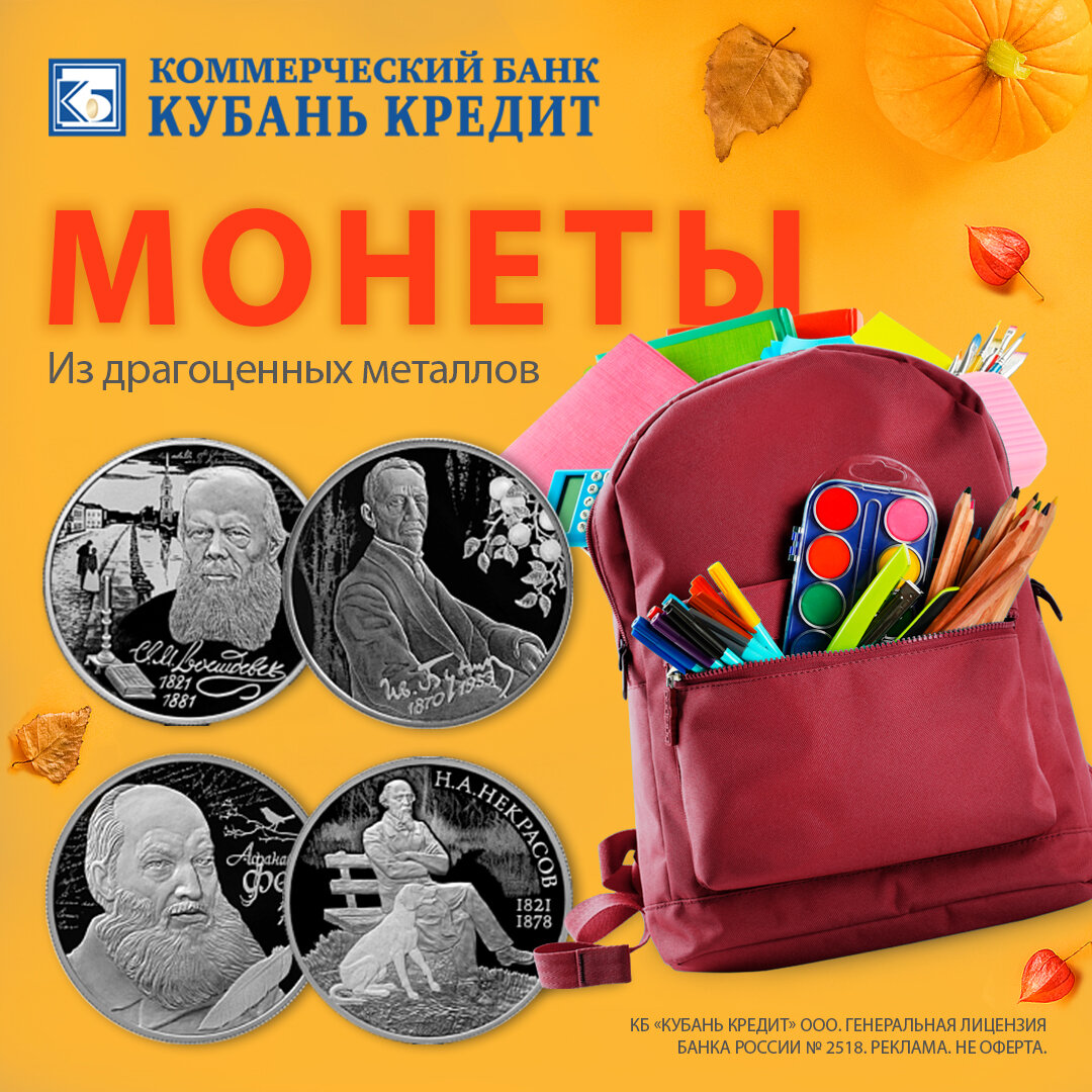 Ломаете голову над тем, что подарить ребёнку или учителю на День знаний? Не ломайте. Мы за вас уже все придумали! Никаких пеналов, гелевых ручек или конфет с цветами. Подарите Достоевского. Мы сейчас не о томике "Преступления и наказания". Мы о монетах с портретами русских классиков. Как идея? Фет, Некрасов, Достоевский, Бунин - бесценные писатели и поэты на монетах из драгоценных металлов. Ммм, мечта нумизмата. Если вдруг идея вас не воодушевила, так это только потому, что вы не держали в руках задумчивого Бунина или сурового Достоевского. Выбрать монеты можно на сайте https://kk.bank/monety/ Финансовые услуги оказывает «Кубань Кредит» ООО