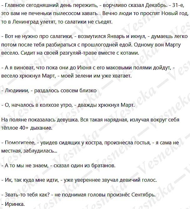 Сказочный привет! Двенадцать мужчин разных возрастов сидели на заснеженной поляне дремучего леса около большого костра. Все они были братьями. - Ну что, у кого какие ставки, - веселился Март. - Кого в этот раз к нам занесёт. ПыСы. Так и сидят двенадцать братанов на заснеженной поляне у костра и всегда готовы к встрече с не званными гостями. Так что, если Вас вдруг волшебным образом занесёт на эту поляну, храните доверенную тайну))