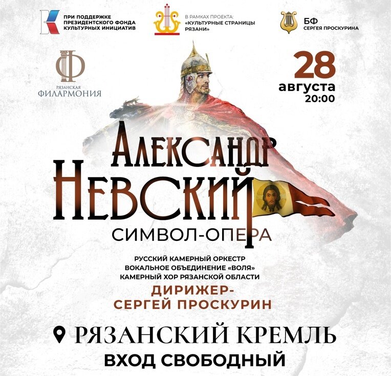 Символ-оперу «Александр Невский» бесплатно покажут символ-оперу «Александр Невский». – В связи с большим спросом на мероприятие, которое пройдёт в Рязанской Филармонии 27 августа, дарим всем Рязанцам дополнительный концерт, который состоится на территории Рязанского кремля в 20:00. Вас ждет увлекательная постановка о Великом Князе в современной интерпретации. Рок-группа, оркестр, хор, 14 солистов и актеры – более 75 человек на одной сцене в ярком костюмированном шоу, — говорится в сообщении рязанской филармонии. Показ оперы состоится 28 августа в Рязанском кремле в 20.00. Начало развлекательных мероприятий с 18.00. Проект реализуется при поддержке Президентского фонда культурных инициатив. Возрастное ограничение 12+