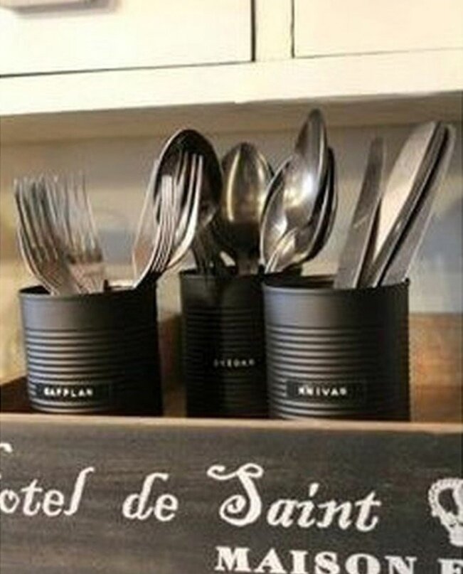 Несколько банок покрасить в яркий цвет и прикрепить с помощью гвоздей к доске, подходящей по размеру, сделать крышу, насыпать корм и ждать крылатых друзей в гости. 2 Подставка под столовые приборы. Опять же роль играет окраска, какая она будет решать вам. 3 Контейнеры для мелочей.