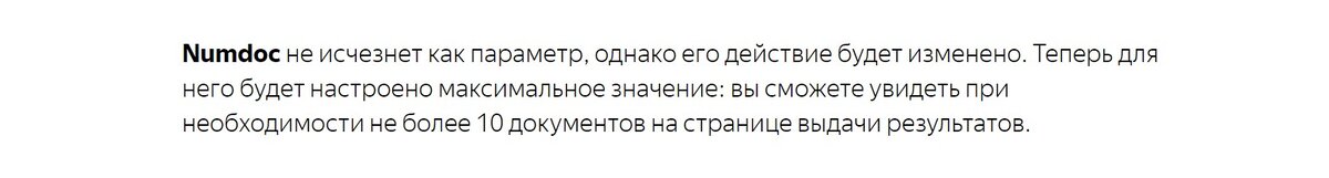 В поисковой системе Яндекса есть специальные GET‑параметры, благодаря которым можно индивидуально настраивать результаты выдачи. Один из таких GET‑параметров — numdoc. Он позволяет управлять количеством документов, отображаемых в поисковой выдаче. В Яндексе по умолчанию всегда показывалось около 10 ссылок на странице результатов запроса, а с помощью добавления numdoc в URL можно было увеличить их до заданного числа. Но, как пишет Яндекс в блоге, numdoc оказывал чрезмерную нагрузку на поисковую инфраструктуру. В связи с этим Яндекс пересмотрел технические особенности применения параметра. Теперь для numdoc будет настроено максимальное значение: пользователи смогут увидеть при необходимости не более 10 документов на странице выдачи результатов. 👇🏻👇🏻👇🏻