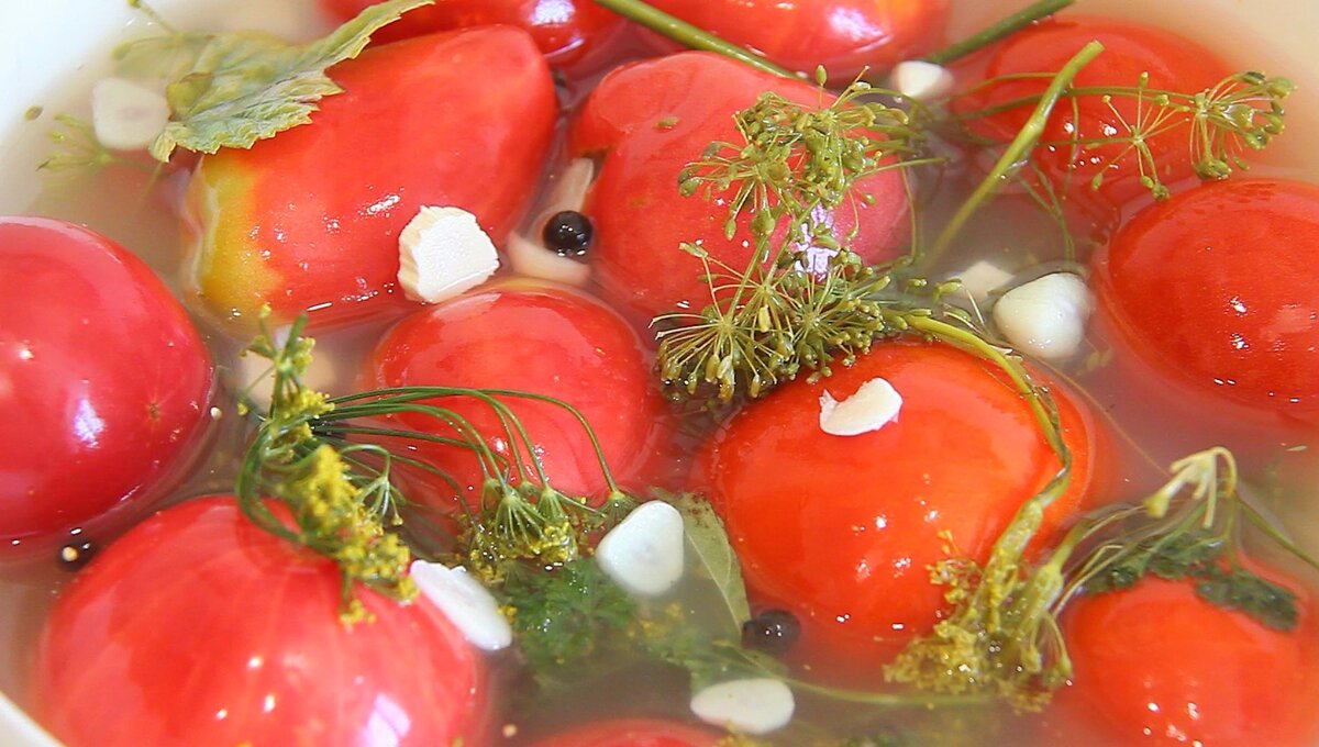 половину нарезанного чеснока и половину нарезанного корня хрена, а также душистый перец и перец черный горошком (можно положить зелень петрушки или сельдерея, листья черной смородины, а также горький перец). Равномерно уложите помидоры. Сверху еще зонтики укропа и оставшийся чеснок с хреном и семена горчицы. Сверху накройте листьями хрена и залейте рассолом. (Расчет на 3,5 кг помидоров: на 3 литра холодной воды 6 столовых ложек соли и 3 столовые ложки сахара) На 1 литр воды: соль 2 столовые