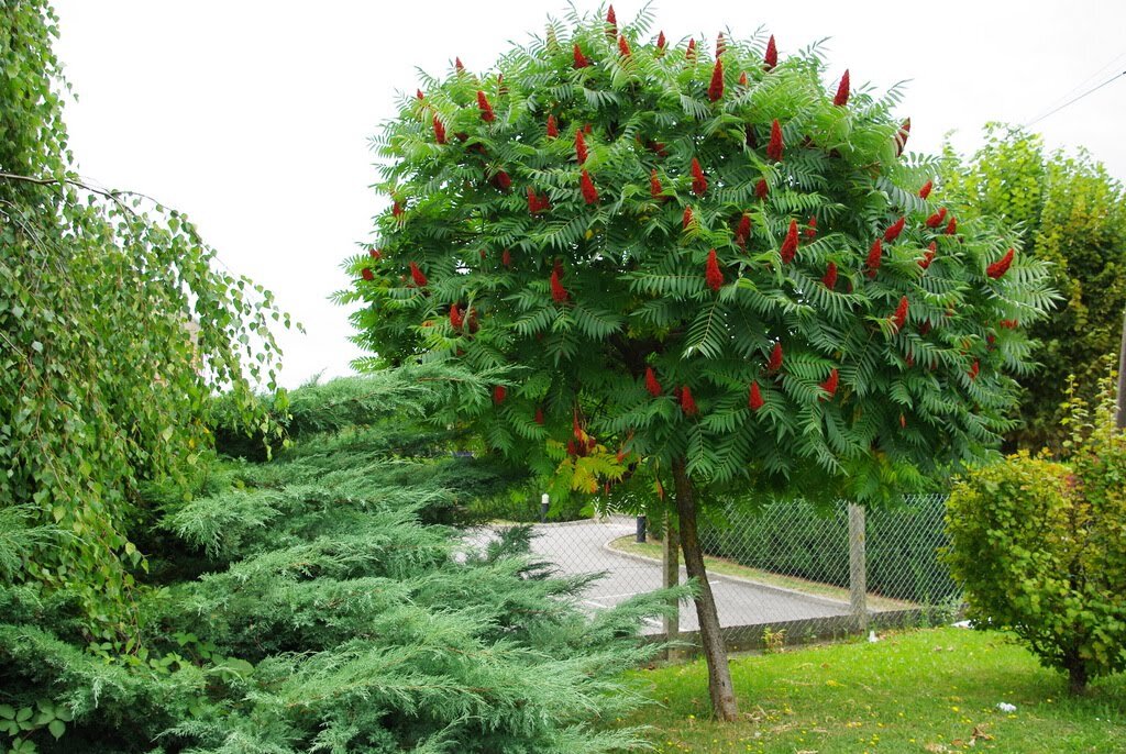 Сумах - небольшое, очень необычное и совсем неприхотливое растение, которое может стать акцентом на любом участке. Один вид, который используется в озеленении, и может выращиваться в нашем климате, называется оленерогим, за схожесть ветвей с оленьими рогами. В целом, это кустарник, либо деревце, с раскидистой кроной, и широко расставленными ветвями. Его также называют уксусным деревом. В естественной среде деревце предпочитает произрастать на солнечных территориях и каменистых склонах. Осенью растение окрашивается в насыщенный оранжевый, огненно- красный или золотистый оттенок. Необычно выглядит и цветение деревца - конусовидные соцветия светло-зелёного или насыщенного бордового окраса достигают в длину до 20 см. Зацветает уксусное дерево не раньше, чем на 4-й год после посадки. Для сумаха выбирают хорошо освещённое место, полутень для выращивания не подойдёт. Несмотря на то, что в природе дерево может расти на каменистых почвах, при самостоятельном выращивании лучше выбрать более пл