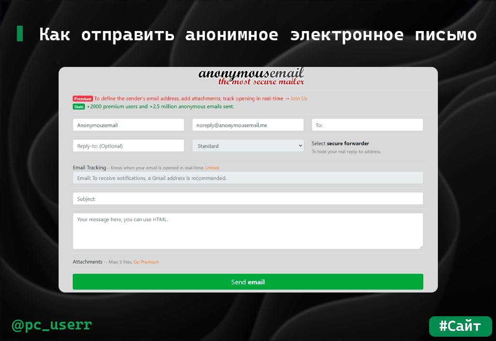 Иногда возникают ситуации, когда нужно отослать анонимное электронное письмо. Но большинство почтовых сервисов прикрепляют к письму также ID устройства или IP отправителя. Чтобы остаться анонимным, можно воспользоваться сайтом anonymousemail.me. Сервис отправляет письмо на указанный адрес со своей почты и не передает вашу информацию. Чтобы отправить анонимное письмо нужно: • Перейти по ссылке • Ввести в поле "To" - адрес получателя, в поле "Subject" - тему и в последнем поле - само сообщение • Нажать "Send email" Источник #сайт #сервис #приватность
