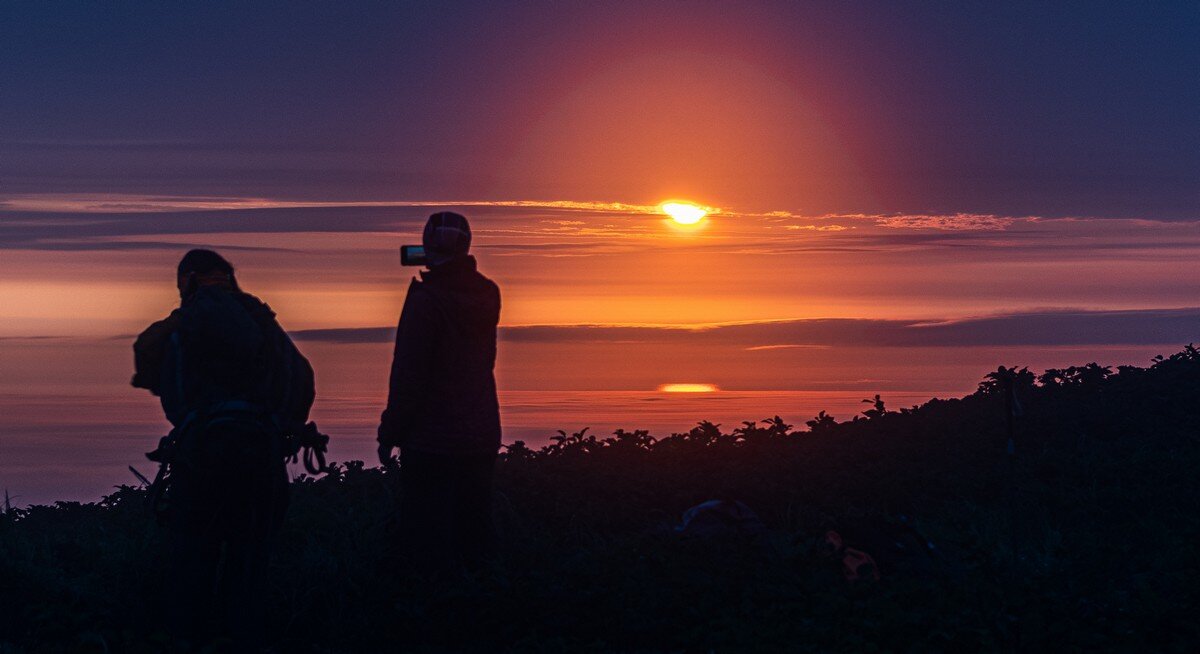 (Первая часть экспедиции на курильский вулкан Креницына здесь) И наступило утро! — «… красит нежным цветом…» (с). Рассвет нас не просто порадовал, это слово как-то мелковато для того восторга, красок и эмоций. Это было просто восхитительно! И весьма обнадёживающе. А вдруг нам повезёт, и с востока нам всё же пригонят голубого неба? Что сдует облака, и мы увидим картинку во всём её великолепии? Ну, полезли вниз… Спуск крутоватый — всего по вертикали лезть примерно 150 метров, но верёвки на этот участок ушло 300м. То есть уклон там местами вполне приличный. Пора грузиться на катамаран. Но нас было 8 человек, посему делаем две ходки. Водичка в озере — чистейшая! Второй «шаттл» прибывает к берегу — плыть там примерно 700 метров. Всё, мы на берегу. Вернее, мы на острове на острове :) На вулкане-острове Креницын на острове Онекотан. Ну, полезли наверх. Сначала всё достаточно пологое… И по вполне комфортным снежникам: Но это счастье, само собой, недолгое. Дальше начинается не «хайкинг и даже н