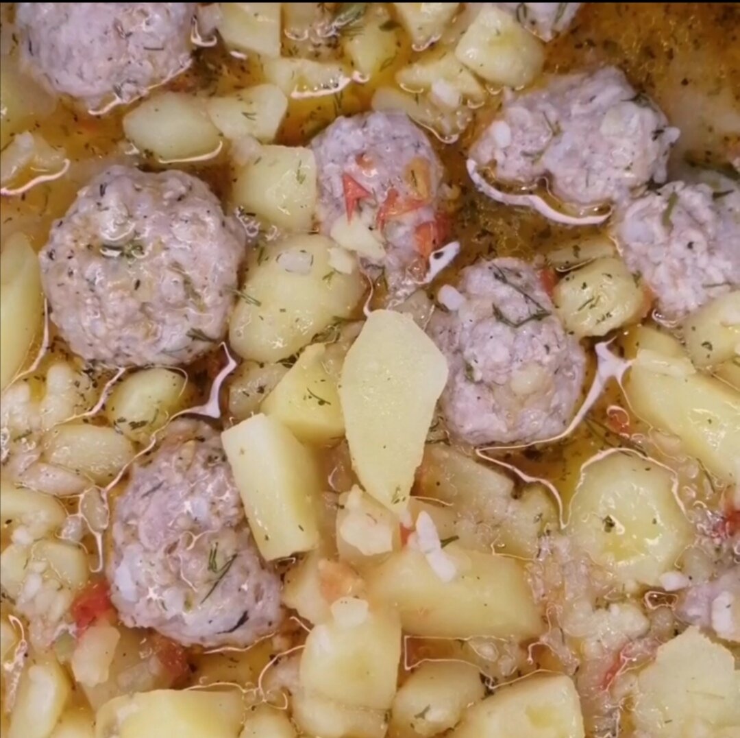 Сытное и ароматное блюдо. Количество продуктов примерное, по желанию и наличию в холодильнике 😁 У меня было в наличии: ☀️Фарш из свинины около 800гр ☀️Помидоры 2 шт ☀️Луковица 3 шт ☀️Рис 1/2 стакана ☀️Картофель около 1.5 кг ☀️Растительное масло ☀️Соль и специи(чёрный перец и сушёная мята), зелень ☀️Вода (а потому что без воды..... 😉) Фарш можно взять любой, какой есть в наличии. ▪️В фарш добавить измельченную 1 луковицу, промытые рис, соль и специи. Немного холодной воды и хорошо вымесить. Слепить фрикадельки. ▪️В кастрюле с толстым дном поджарить 2 луковицы, нарезанные произвольно. ▪️Добавить помидоры, мелко нарезанные и немного пожарить. ▪️Картофель нарезать ломтиками, отправить к поджарке и перемешать с ней . ▪️Сверху выложить фрикадельки, посолить и залить водой не верхом. Тушить до готовности, периодически аккуратно перемешивая. ▪️ В конце зелень и сушёная мята. Ну очень сочно и душисто получилось! Можно добавить морковь и перец болгарский. Пробуйте, подписывайтесь!