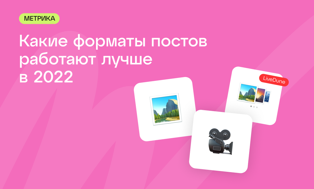 LiveDune провели исследование о том, какие форматы сейчас лучше всего заходят в Запрещенной Социальной Сети. Делимся краткой сводкой результатов. Как проходило исследование Специалисты сервиса выбрали аккаунты, у которых: — Минимум 1000 подписчиков. — Минимум 100 лайков в среднем. — Посты опубликованы в первом полугодии 2022 года. В результате получилось 101 000 актуальных аккаунтов и около 6 млн постов. Самые популярные форматы Больше всего было статических публикаций в форматах «Изображение» (45%) и «Карусель» (32%). Думаем, что дело в простоте подготовки контента — в отличие от динамических креативов. Но как у статики с эффективностью? Спойлер: хуже, чем у других форматов. Лайки и комментарии Важный момент: прочие метрики для анализа «Изображений» мы брали за 100%, так как именно этот формат публикаций встречается чаще всего. Больше всего сердечек — у Reels. Их лайкают на 94% чаще, чем «Изображения», на 76% — чем «Видео» и на 60% — чем «Карусели». Почему? Мы связываем лидерство Ree
