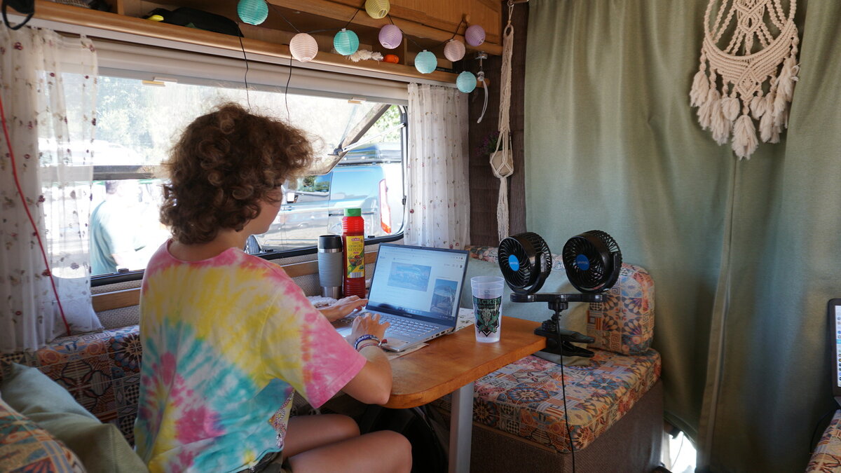 Саша проснулся раньше и вынес туалетную кассету. Я нехотя встала, умылась, собрала кровать. Выпила стакан воды и села за статью: утром голова лучше соображает и проще не отвлекаться на мелочи. Дописываю статью и делаю зарядку. Соседи ушли по делам, поэтому разминаюсь на улице. Не люблю, когда смотрят. Завтрак простой: черника, булочка с соленым маслом и апельсиновый сок. Кофе не пьем уже месяц. Саша философствует о дальнейшем развитии. Я отвлекаюсь и слушаю вполуха. Когда градусник показывает +45, Саша приглашает в прачечную на велосипедах. Как вовремя! На Гугл картах нашли прачечную самообслуживания с нормальными ценами: 4 евро стирка и 1,5 евро сушка. Загрузили стирку и пошли в ближайшее кафе выпить холодного Schlösser Alt. 45 минут прошли в приятном ожидании. Вернулись в прачечную загрузить сушку и поехали в дешевый маркет Aldi за продуктами. Назад ехали груженые, сильно пропотели и по возвращении приняли душ. Хорошо, что в кемпинге он бесплатный. Сосед на стареньком автодоме пригл