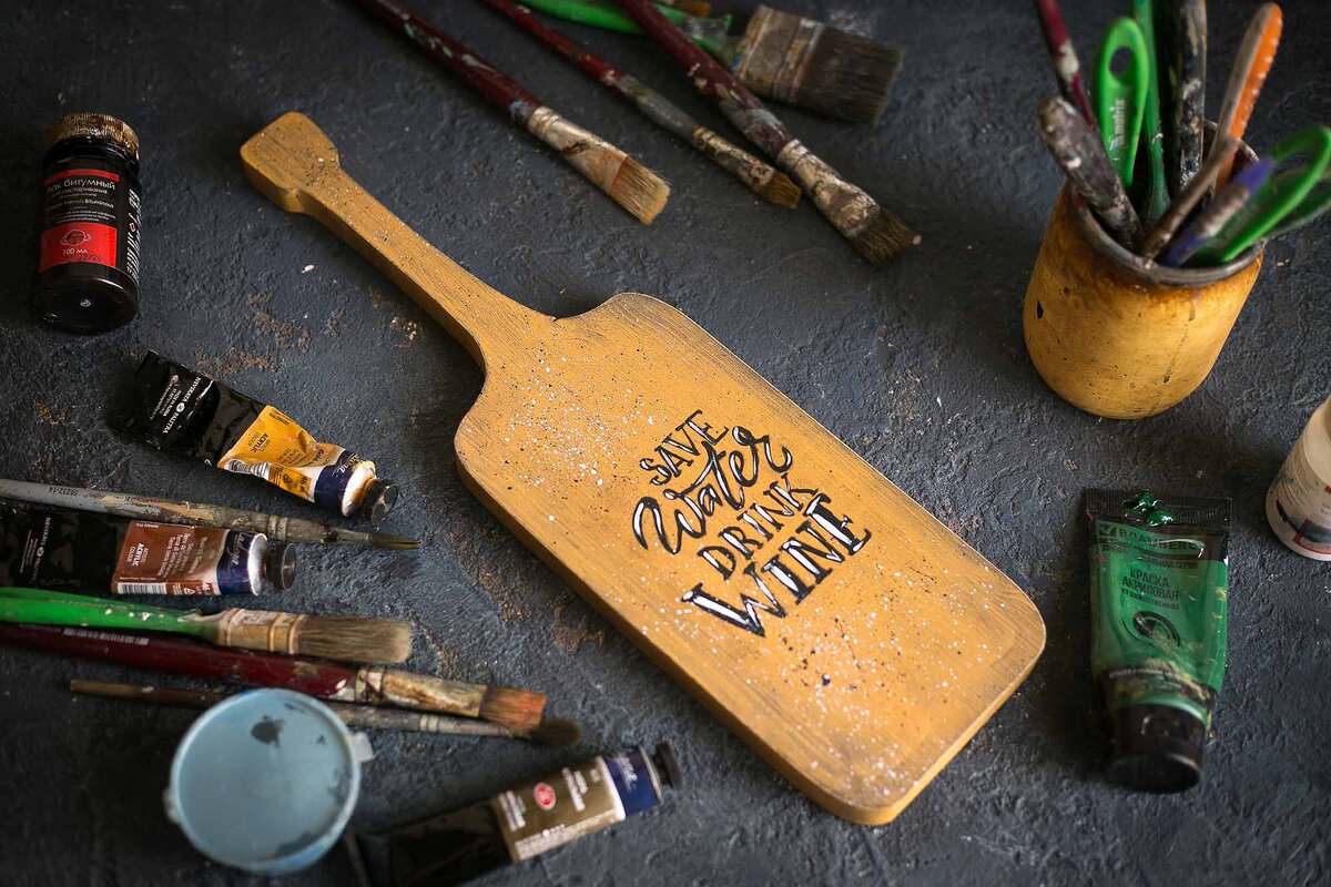 Привет, друзья, сегодня предлагаю задекорировать доску на кухню в современном стиле. Её можно использовать и как разделочную и как доску для подачи и просто для декора. Для работы нам понадобится: Для начала, покрываем доску пропиткой или морилкой. Я использовала пропитку на водной основе от фирмы Dufa. В случае, если вы используете морилку, потом покройте её двумя слоями лака. Если вы планируете использовать доску для резки или подачи, обратную сторону покройте маслом для посуды (морилкой не покрывайте). После высыхания пропитки, я наношу желтую. акриловую краску в два слоя. Как только краска высохнет, беру салфетку смоченную в спирте и протираю края, проявляя нижний слой. Затем вытираю чистой влажной салфеткой и покрываю лаком. Для переноса изображения на доску можно использовать копировальную бумагу (она до сих пор продается в канцелярских магазинах) или пастель. Для того, чтобы перенести изображение с помощью пастели, закрасьте обратную сторону распечатки плотным слоем. Положите