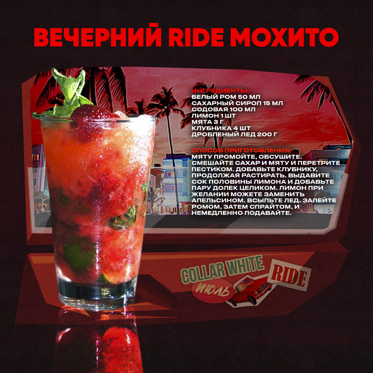 Catch a vibe last night, tonight is the sequel🍸🍓 Если одного освежающего Ride-мохито оказалось мало, то переадресуй такси туда, где горчинка, свежесть и бодрящий бит смешаются со сладко-клубничным вкусом летних ночей. И пока по стенкам бокала медленно стекают капли, включи «Ride» ещё раз и позволь звуку заполнить все пространство вокруг🎧