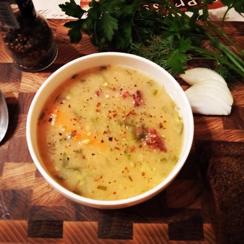Добрый день дорогие читатели, Вашему вниманию представляю свой рецепт томленого горохового супа с копченостями, и так приступим В приготовлении данного блюда, я практически всегда использую целый горох. Копчености выбираю под настроение....... Вкус и запах неповторим!!!!!! Как говорила моя бабушка, томление очень важный процесс для раскрытия полного вкуса любого блюда. Что получилось Вы можете увидеть на моем фото, а также самим попробовать и насладиться незабываемым ароматом и вкусом данного блюда.