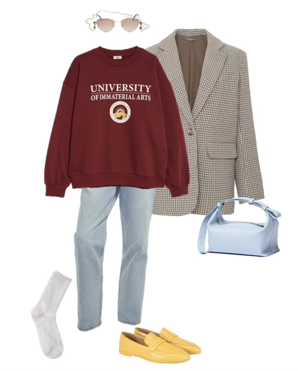 Об универсальности предметов гардероба в наше время можно петь оды. Ведь, действительно, что ни возьми, всё можно: кроссовки с платьем, лоферы с джоггерами, туфли с "брюками строителя" и т.д. И это всего лишь малая часть того безумия, которое можно воплотить в жизнь. Сегодня рассмотрим пример стилизации толстовки, на сколько это универсальная вещь, на сколько интересны могут быть образы с ней. В качестве примера я взяла толстовку российского бренда LIME https://lime-shop.ru/product/11734_8326_880-bordovyi Толстовка конечно же сочетается с любимыми всеми нами джинсами https://12storeez.com/catalog/jeans/womencollection/dzinsy-mom-211-115925 Но образ был бы скучноват, если бы мы не добавили к спортивной толстовке классический твидовый жакет https://lichi.com/ru/ru/product/42626 . Дополним образ сумкой https://coinsbrand.ru/preorderbobbiminisky в тон джинсам, а акцент в образе сделаем на ярких лоферах https://ekonika.ru/catalog/view/en645001saffron22l . Белые же носочки ещё более повыся
