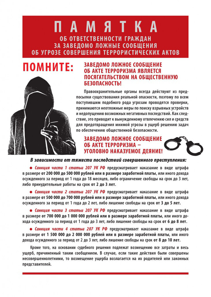 Заведомо ложное сообщение об акте терроризма — уголовно наказуемое деяние! Антитеррористическая комиссия городского округа Нальчик информирует, что заведомо ложное сообщение об акте терроризма является преступлением, предусмотренным статьей 207 УК РФ. К заведомо ложным сообщениям об акте терроризма относятся сообщения о готовящихся взрыве, поджоге или иных действиях, создающих опасность гибели людей, причинения значительного имущественного ущерба либо наступления иных общественно опасных последствий. При этом данные сведения являются заведомо ложными, то есть не соответствующими действительности. За совершение данного преступления предусмотрено наказание до 3 лет лишения свободы, а в случае если преступлением причинен крупный ущерб или наступили иные тяжкие последствия – до 8 лет лишения свободы. Уголовной ответственности по статье 207 УК РФ подлежат вменяемые лица, достигшие 14-ти летнего возраста.