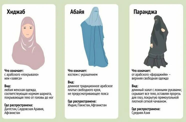 Одежда должна быть свободной, не должна облегать. У мусульманки должно быть длинное свободное платье, а не штаны. Яркая, нарядная одежда и украшения допустимы только перед собственным мужем. Одежда мусульманки не должна быть похожа на одежду женщины любой другой религии. Мусульманкам нельзя носить обувь на каблуке. И хотя ношение хиджаба - это обязанность, на самом деле в этом заключается забота о женщинах и большое благо. Хиджаб в Коране. Женское покрывало, хиджаб, защищает женщину от непристойного отношения, а также подчёркивает её скромность и достоинство. Вместо хиджаба можно носить и никаб, паранджа, чадра, джильбаб, абайя и химар . Нельзя мусульманке носить штаны, даже если она в хиджабе. Мусульманка должна одеваться так