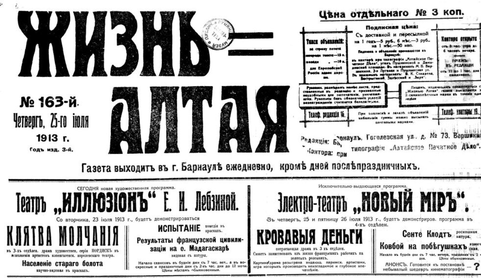 «Жизнь Алтая» — ежедневная общественно-политическая и литературная газета, издававшаяся в 1911—1918 годах в Барнауле. Довольно часто в ней публиковались новости из Усть-Чарышской Пристани. Будем читать некоторые из них вместе с вами - открывать новые подробности "старой" Усть-Пристани. Вот например, «Жизнь Алтая», 1913 год, четверг, № 163 от 25 июля. «От собств. корресп.