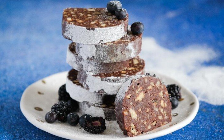 ИНГРЕДИЕНТЫ ПОШАГОВЫЙ РЕЦЕПТ ПРИГОТОВЛЕНИЯ Шаг 1 Размягчите масло при комнатной температуре. Для «жирка» шоколадной колбасы две трети печенья разломайте на маленькие кусочки. Остальное – для «мяса» – растолките толкушкой в очень мелкую крошку. Орехи крупно порубите. Шоколад наломайте небольшими кусочками. Шаг 2 Сливки налейте в кастрюльку, доведите до кипения, всыпьте смешанный с какао-порошком сахар, тщательно перемешайте и варите пару минут, чтобы сахар и какао полностью растворились. Шаг 3 Переставьте кастрюльку на водяную баню на большую кастрюлю, на треть заполненную слабо кипящей водой, добавьте кусочки шоколада и перемешивайте, пока шоколад не растопится. Шаг 4 Снимите с огня, дайте минутку постоять, затем добавьте сливочное масло и перемешивайте до тех пор, пока масса не станет гладкой. Шаг 5 Всыпьте мелкую крошку из печенья и снова тщательно перемешайте. Добавьте кусочки печенья и орехи, аккуратно перемешайте. Шаг 6 Получившееся тесто переложите на пленку, слепите колбаску. За