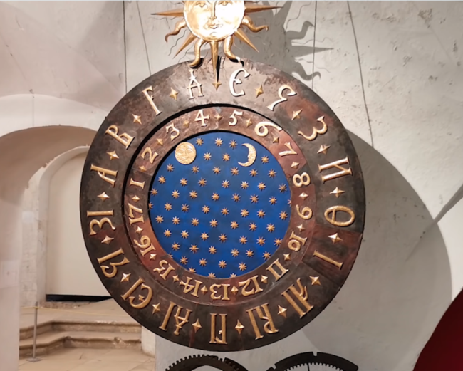 Самой популярной достопримечательностью Москвы несомненно является Московский кремль и его Спасская башня, на которой находятся часы. Но мало кто знает, что современный циферблат этих часов появился не так уж и давно. А до этого он имел совершенно другой и непривычный для современного человека вид. Первоначальный же вид циферблата этих частов имел характерный для ведического мировоззрения солярный знак изображения Солнца сверху. При этом, внешний "солнечный" круг имел 17 делений, обозначенных древнерусскими буквами и он был неподвижным. Внутренний "лунный" круг также имел 17 делений, но они обозначались уже цифрами. Вращался именно этот циферблат, обозначенный арабскими цифрами. И первые такие часы были установлены еще в 1404 году на Фроловской башне белокаменного Московского Кремля. Христианские летописи гласит о том, что создание этих часов принадлежит монаху Лазарю. Однако, эта версия не выдерживает никакой разумной критики, ибо не мог христианский монах создавать часы с хара