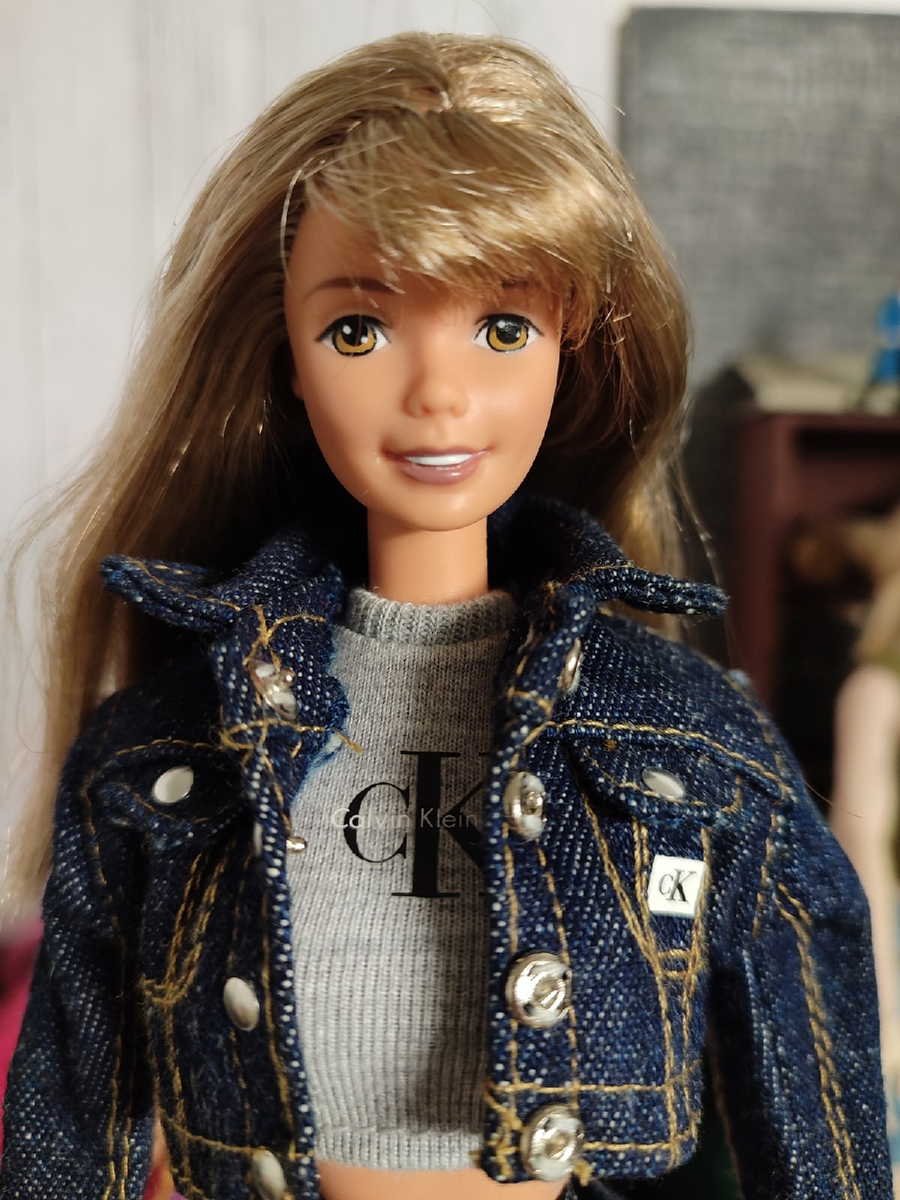 Как можно "случайно" купить куклу выпущенную почти тридцать лет назад? А вот так, в современном мире возможно все. Кукла приглянулась мне необычной для кукол тех времен внешность при весьма характерном для 90-х стиле. Я уже предпринимала попытки завести "винтажную" барби и рассказывала о ней тут. Но в этот раз мне попался на вторичке экземпляр на родном теле (ох, какое же оно странное по нынешним временам!) и в родной одежде. Не хватает только ветровки и рюкзака, даже подставка на месте. Жители моей полки в шоке. Далее я буду использовать некоторые фото от Annabelle80 с бейбиков, так как свою даму я пока не раздевала. Конечно, как можно догадаться из названия, девушка одета не только в джинсу и топик, но и в фирменное белье. Это выглядит довольно мило. Девочка с молдом супер-стар была выпущена в сотрудничестве с брендом Calvin Klein ограниченной серией специально для сети универмагов Bloomingdale’s. В то время, когда обычные барби стоили 5-10$ ценник на этой девушке был выставлен $70