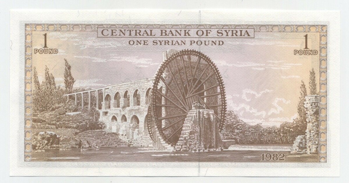 1 фунт 1982 года Сирия. Почему нория? Что за сооружение? Попробуем ответить на эти вопросы. Нории - это высокие водяные колеса с коробчатыми отделениями для сбора воды, встроенными вокруг их обода. По мере того, как река течет, она погружает эти емкости для сбора воды под воду, где они быстро заполняются, а затем поднимаются на вершину колеса, где они сливаются в акведук. Акведук может нести воду для снабжения зданий, садов и сельскохозяйственных угодий. Сирия местами крайне засушлива, а вода - это жизнь. Колеса , приводимые в движение водой, протекающей под ними и толкающей лопасти колеса. Что касается высоты, то самая высокая из норий составляет 21 метр в диаметре, а самая маленькая - 7 метров. По крайней мере, пять из этих норий имеют длину 17 метров или больше. Эти колеса сделаны из разных пород дерева для разных деталей. Массивные оси и подшипники изготовлены из орехового дерева, в то время как для изготовления других деталей колеса широко использовался тополь, также упоминалис