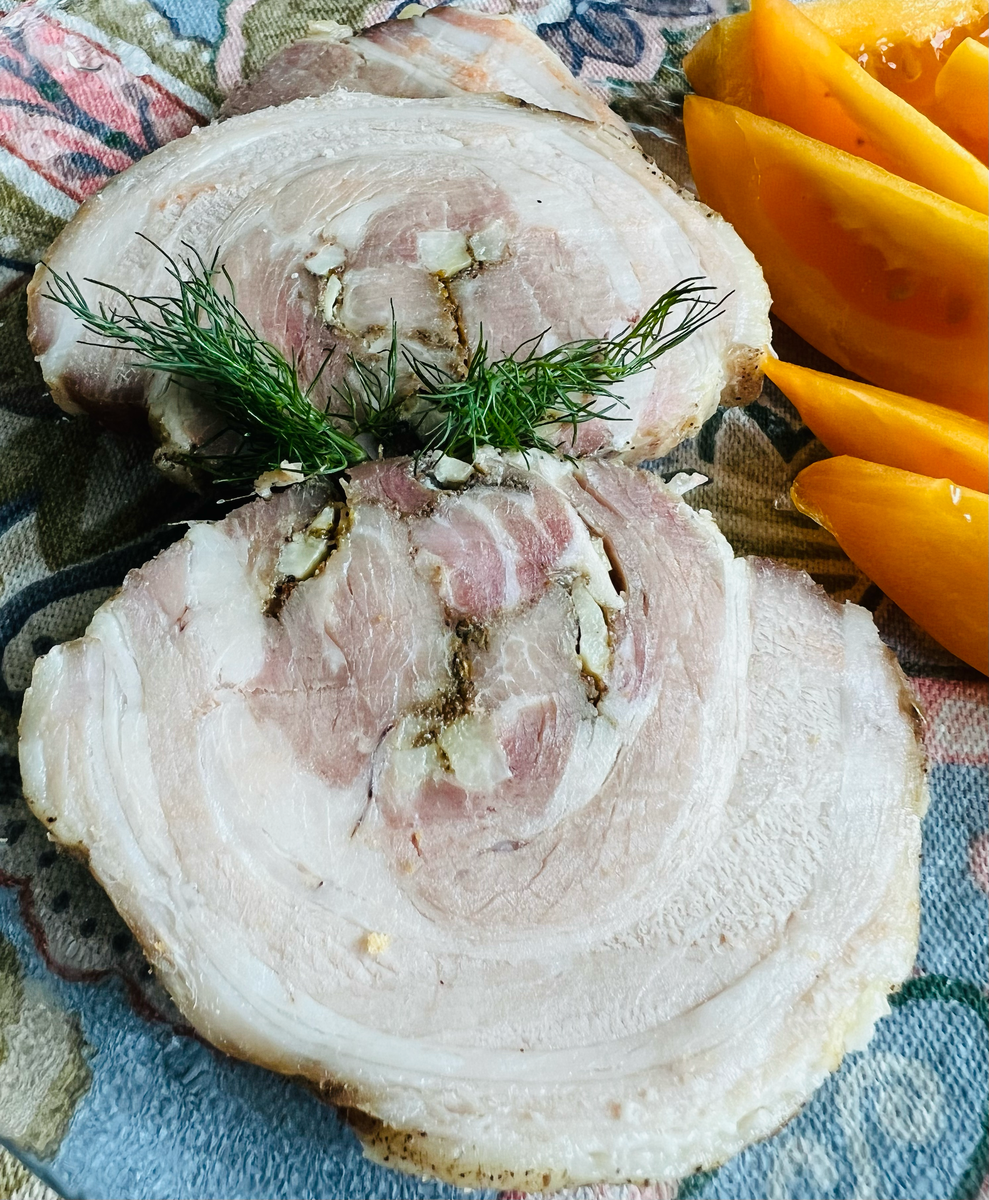 Перечислять блюда с поркеттой можно очень долго, но давайте приготовим ее саму. На самом деле это знакомая всем нам грудинка с чесноком и специями. В классическом рецепте итальянцев шкурка с грудинки не снимается, но я адаптирую этот рецепт ради нашего удобства и уберу шкуру.