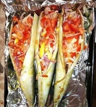 Фаршированная скумбрия в духовке Скумбрия по этому рецепту готовится ну очень просто, а получается и сочной, и вкусной, и ароматной. От такой аппетитной фаршированной рыбки очень сложно отказаться, попробуйте! Для приготовления вам потребуются такие ингредиенты: — скумбрия, 2 шт; — лук, 1 шт; — помидор, 1 шт; — лимон, половина; — масло растительное, 3 ст.л; — соевый соус, 1 ст.л; — приправы к рыбе, майонез, соль, перец, зелень. Подготавливаем рыбу, убираем внутренности и плавники, голову. Для маринада смешиваем все специи, соль, перец и растительное масло, соевый соус. Смазываем рыбу внутри и снаружи. Противень застилаем фольгой, выкладываем рыбу и оставляем так на 20 минут. Лимон и лук режем тонкими полукольцами и укладываем их внутрь рыбы. Смазываем тушки майонезом и сбрызгиваем соком лимона, посыпаем рубленой зеленью, накрываем фольгой. Духовку разогреваем до 180 градусов и запекаем 30 минут. Вынимаем снимаем верхнюю фольгу и запекаем без нее еще 10 минут.