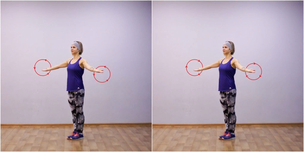 - Медленно описывайте руками небольшие круги диаметром около 15 сантиметров. В основном движение исходит от плеч, напряжение чувствуется в их задней части.