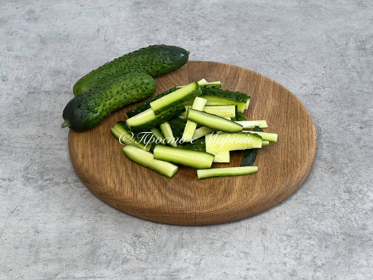 В сезон огурцов — это именно то, что нужно. А если ещё и овощи со своей грядки… Привет, друзья! Вы на канале «Просто с Марией», и сегодня я хочу поделиться с вами простым рецептом яркого огуречного салата. Если у вас есть свой огород, то наверняка и за продуктами бежать не придётся. Разве что за специями: здесь они играют не последнюю роль. А если подать такой салатик в красивой посуде, то получится вполне себе неплохой вариант для праздничного застолья. Рецепт не нов, но на моём канале его ещё не было. Пусть будет! Приступаем к приготовлению. Огурцы нарезаем достаточно крупными брусочками: здесь важна именно такая нарезка. Солим и отставляем в сторонку на 5-10 минут. Тем временем измельчаем морковь на «корейской» тёрке. Слегка мнём руками и перекладываем в салатник к огурцам. Следом кладём чеснок, пропущенный через пресс. Количество чеснока можно регулировать по своему вкусу. Для меня 2 зубчика — золотая середина. Теперь добавляем сахарный песок, красный жгучий перец, хмели-с