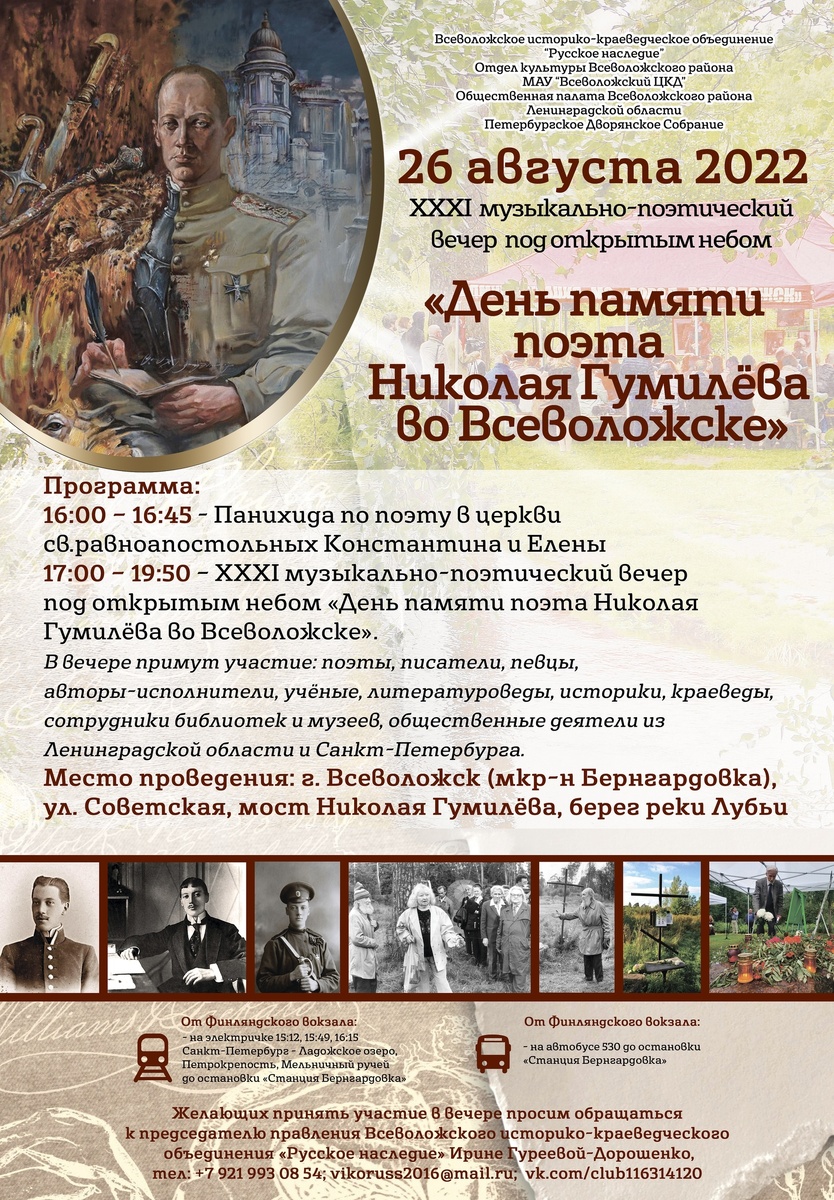 Друзья, приглашаем вас 26 августа во Всеволожск на мероприятия, посвящённые скорбной дате - 101 годовщине со дня расстрела классика русской поэзии Николая Степановича Гумилёва. В этом году мы объединились с отделом культуры Всеволожского района, Всеволожской Межпоселенческой библиотекой, Комитетом по культуре Ленинградской области, Ленинградской областной научной универсальной библиотекой и Драматическим театром "На Литейном", который специально к этому дню поставил спектакль "Соучастник". День памяти поэта Николая Гумилёва начнётся в 12:00 на Ржевском полигоне панихидой. Это второе предполагаемое место расстрела Николая Степановича. Затем мы посетим книжную выставку и посмотрим спектакль. После спектакля, по тридцатилетней традиции мы встретимся на Бернгардовке в церкви Константина и Елены на панихиде и возложении цветов к памятнику Н.С. Гумилёву, который установлен в церковном дворе в 2016 г. В 17:00 на берегу реки Лубьи начнётся традиционный творческий вечер "День памяти поэта Никол
