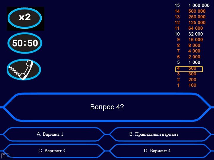 В оригинальной игре с ТВ каждый участник в погоне за миллионом должен был пройти путь длиной в 15 вопросов. В каждом по четыре варианта ответа. Мы же находимся в школе, так что биться наши ученики будут за оценки. Время на уроке не резиновое, так что ограничимся пятью вопросами. Логика простая — оценка равняется количеству правильных ответов. Старайся соблюдать временной лимит, не больше пяти минут на каждого участника.