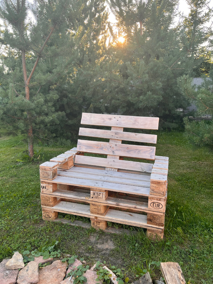 Сегодня покажу вам как быстро сделать кайфовое кресло (даже получается двухместное) из европоддонов. Почему евро? Потому что они имеют стандартные размеры. Понадобятся 4 поддона, саморезы, шуруповёрт, лобзик и что-то для шлифовки-у меня болгарка, краска по желанию. Я шлифовала только 2 верхних поддона, один из которых-сидушка, а второй-спинка с подлокотниками Сверху фото До снизу после шлифовки Следующий шаг: я положила поддон на то место, где планирую поставить кресло, лучше делать так, потому что они очень тяжелые и готовое кресло будет проблематично переставить. На фото сверху вы можете заметить, что снизу у меня другой поддон. Все верно, это мое 4-е кресло😅 поэтому не хватило одного поддона, и я решила подставить самый обычный. Второй поддон снизу кладём вверх ногами, а третий как положено, таким образом сбоку получаем нечто похожее на полку или дополнительное хранение. Все поддоны на месте, приступаем к распилу. Пилим как на фото 4 доски слева и справа у края, пятую не трогаем,