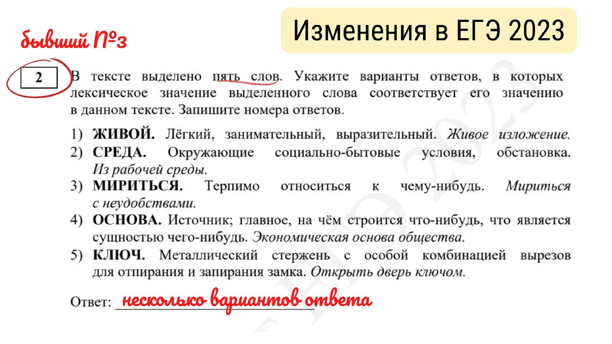 Очень долго задание №2 (бывшее №3) оставалось без изменений. В нём для анализа предлагался фрагмент словарной статьи, где были даны значения одного слова: от 4 до 7. Выбрать необходимо было только одно - то, которое реализовалось в предложенном тексте. Теперь же на выбор предлагают 5 слов со значениями, а в задании сказано: «Укажите варианты ответов, в которых лексическое значение выделенного слова соответствует его значению в данном тексте». В этой формулировке следует обратить внимание на множественное число слова «варианты». Вероятно, теперь количество ответов не будет ограниченным. Может, таких слов будет 2, или 3, или все 4.