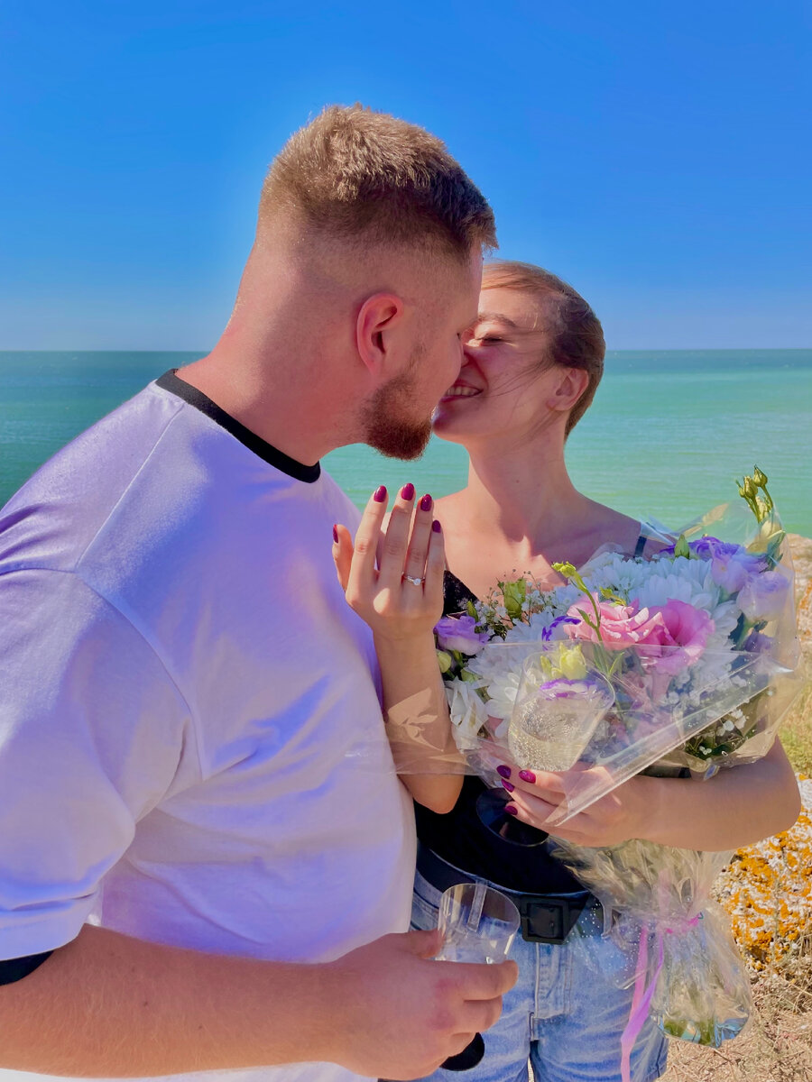 Это случилось 100% неожиданно, красиво, волшебно и идеально в моем представлении. Я всегда желала, чтобы это произошло в кругу близких. Мне не хотелось получить кольцо на воздушном шаре, в ресторане на крыше или где-то ещё в красивом месте. Важнее разделить радость и получить её от родных людей в этот судьбоносный день. И вот наш отпуск, отправились на Таманский полуостров. Я не догадывалась, но предполагала, что это может случиться вот-вот, но каждый раз обстоятельства прерывали мечты и спускали на землю. Например, был момент, когда Витя (теперь мой жених) попросил достать ключи из машины и закрыть окна, якобы сам забыл это сделать. Все (сестра, брат и их пары) сидели за круглым столом, и я подумала: «Хотят обсудить 💍». Но машина правда была открыта с ключами в зажигании. «Нет, он бы не додумался далеко заранее так оставить, чтобы потом попросить выйти. Не пытай себя надеждами.» Пошёл второй день отдыха на побережье, решили поехать в Крым на генеральские пляжи. Я оделась обычно