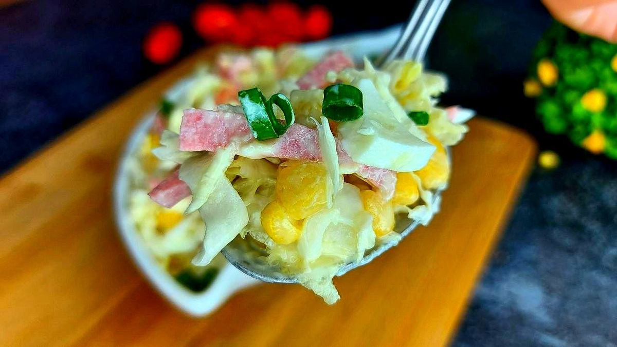 Простейший салат: капуста, колбаса, кукуруза, яйца, майонез. Всё. Никогда не устаю его готовить (вкусно)