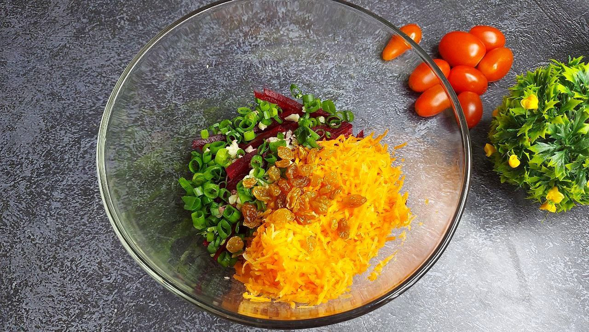 Мама частенько говорила мне про этот салат. Сегодня приготовила на пробу. Ещё и повезло, все необходимые продукты были дома. Не пожалела, очень вкусный и простой салатик. Маме спасибо. Уверена многим понравится. Советую приготовить. Для него понадобится: Итак, свеклу нужно отварить или запечь, выбирайте вариант, который вам больше нравиться. Как только свекла остынет, очищаем от кожуры. Нарезаем тонкой соломкой. На мелкой терке натираем свежую морковь. Измельчаем зелень и чеснок. Изюм замачиваем в кипятке, ждём 5 минут. Затем его нужно обсушить с помощью бумажного полотенца. Если изюм не нравится, то добавьте яблоко. По желанию можно добавить грецкие орехи, предварительно их слегка обжарить на сухой сковороде. Но я не люблю эти орехи. Кому-то нравится с сыром, мне кажется, он здесь не нужен. Заправляем салат майонезом. Соль, перец по вкусу. Перемешиваем. Убираем в холодильник на 15 минут и готово. По желанию выкладываем салат в красивый посуду. Прекрасный салат, который можно п